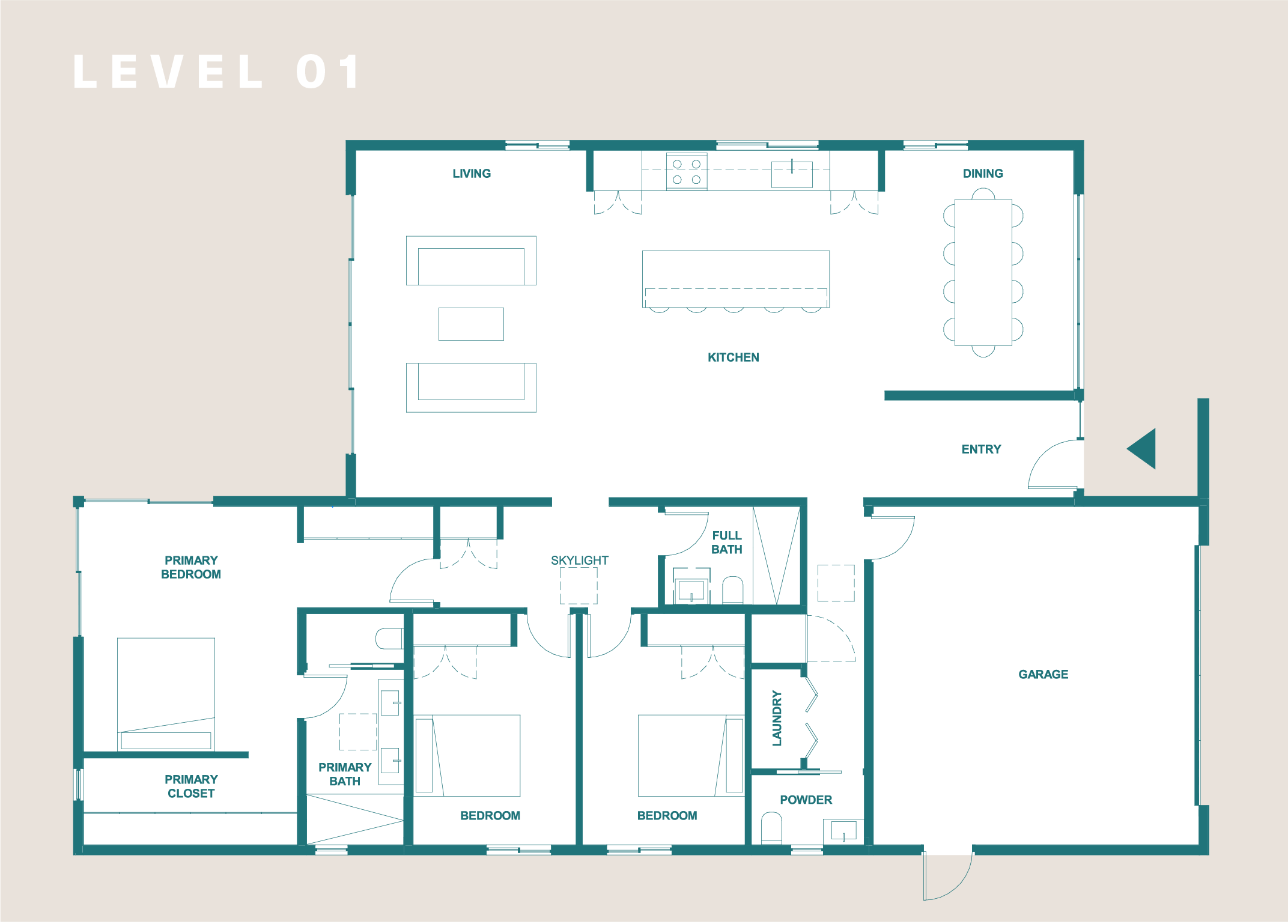 At the center of the great room, a monumental island anchors a sleek kitchen arranged against the side-yard wall and flanked by a dining room overlooking the front garden and living room opening onto the panoramic back patio. Skylit vestibules off the great room open onto two secondary bedrooms, a full bath, and the primary suite where an open-corner window offers seamless views of the Pacific.